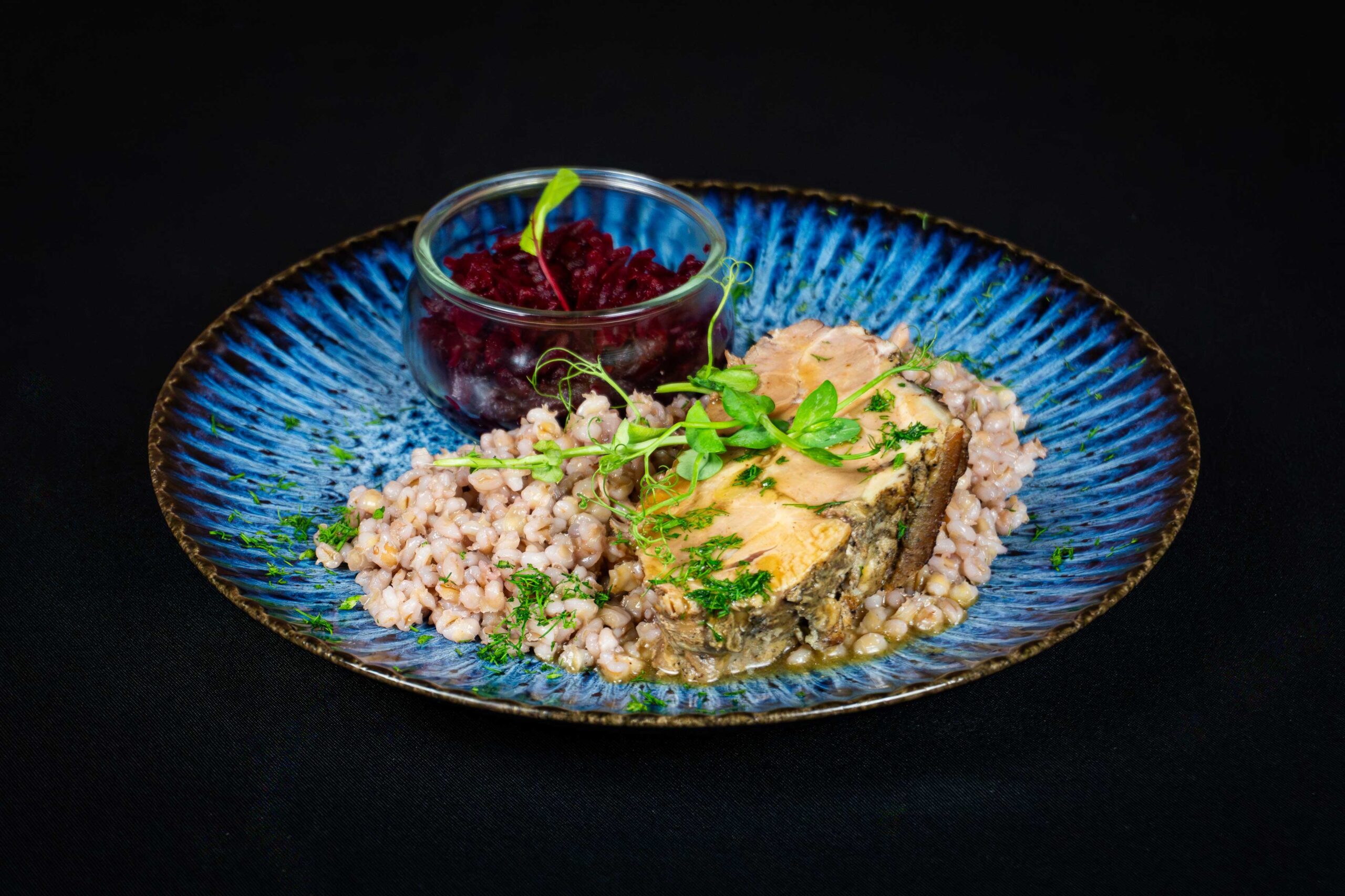 Karkówka w sosie pieczeniowym z kaszą pęczak i buraczkami