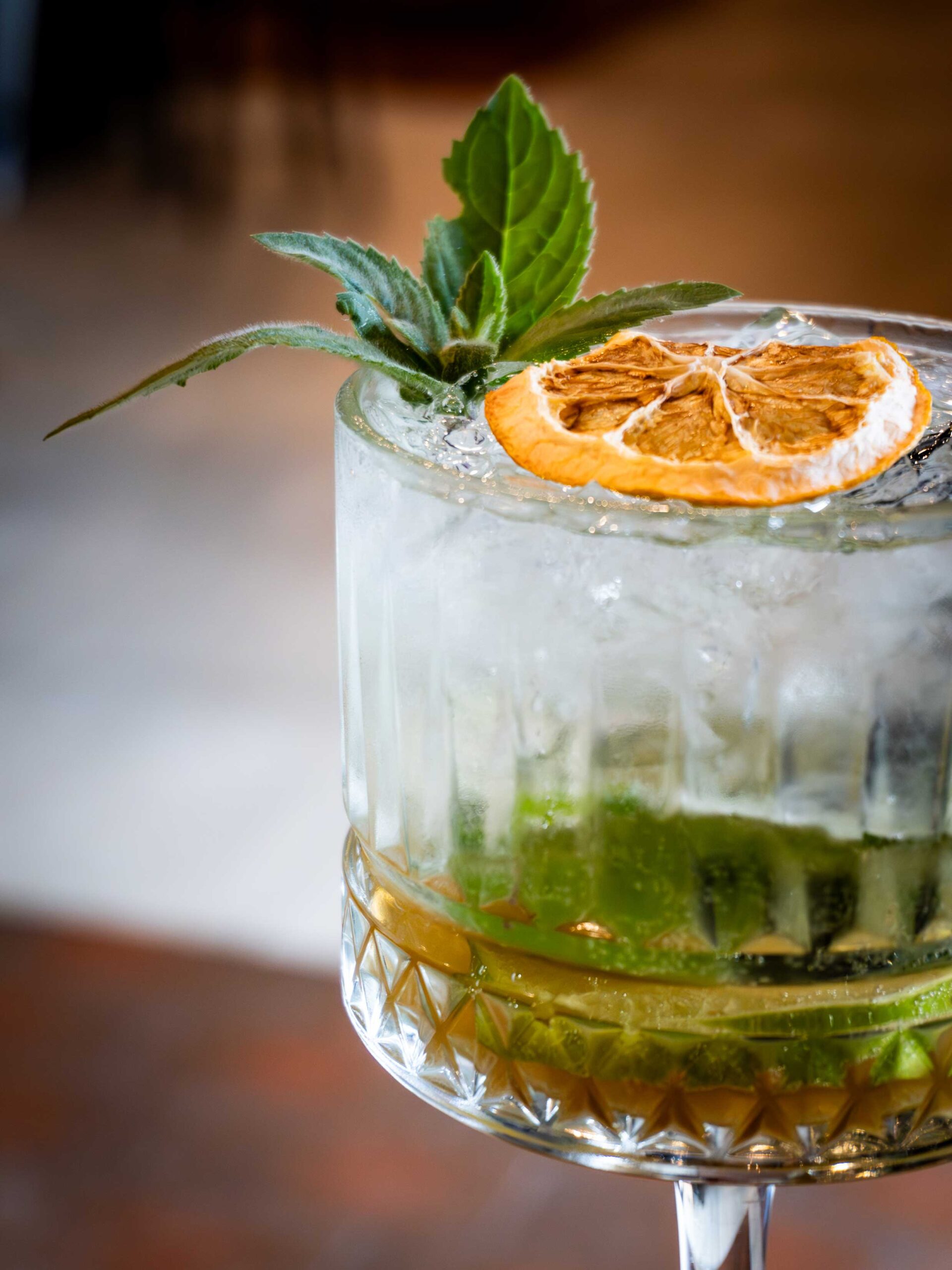 „Citrus Garden” to elegancki, orzeźwiający drink serwowany w szkle na nóżce z grawerowanym wzorem. Jego przejrzysta struktura skrywa zielone listki świeżej mięty, cienki plaster suszonej cytryny i dużą ilość lodu, które razem tworzą wizualnie zachwycającą kompozycję.