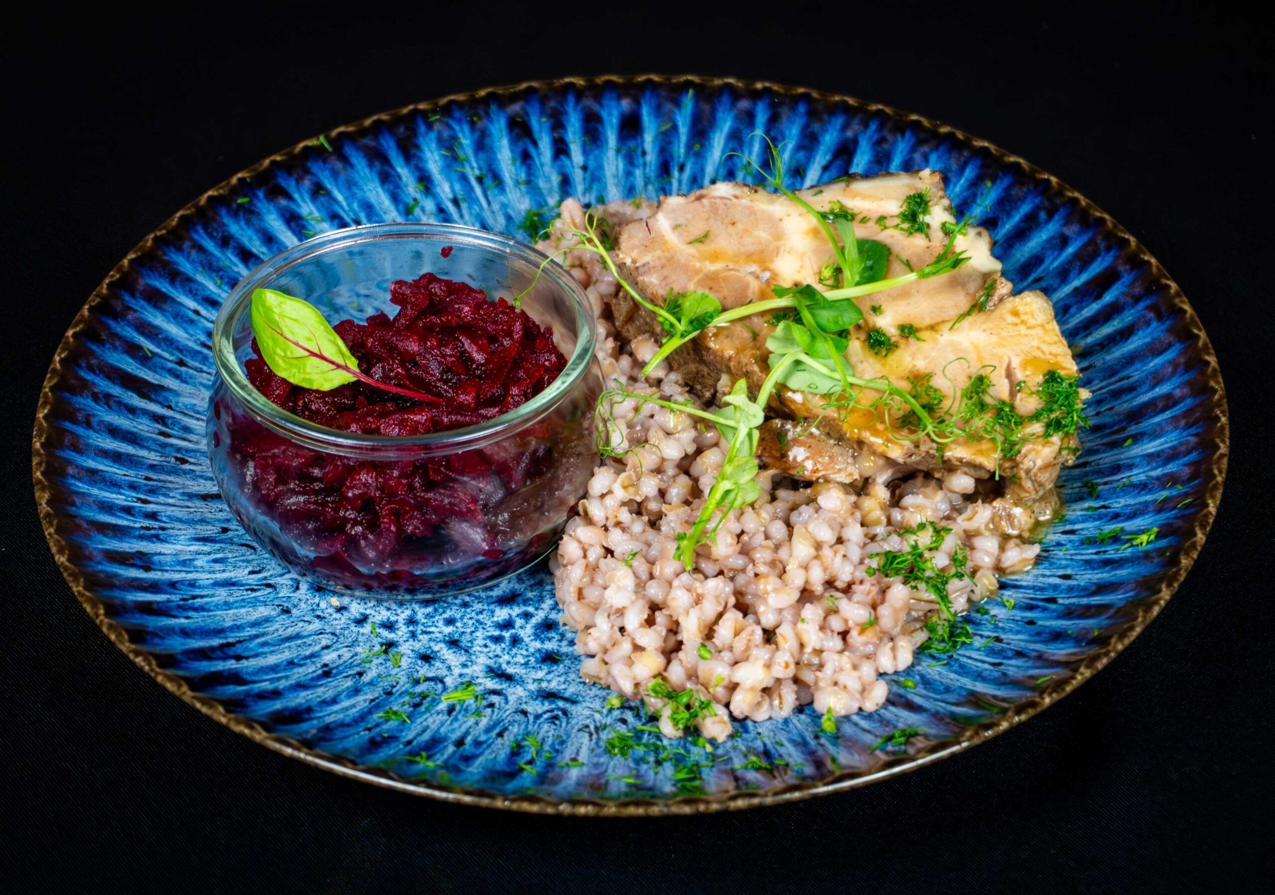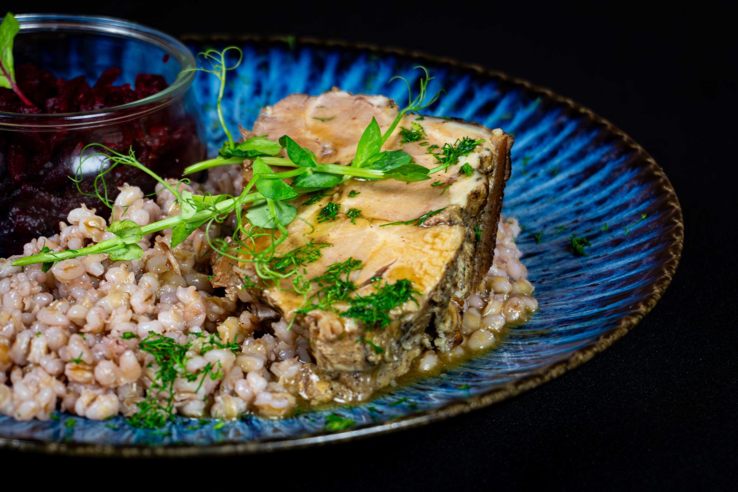 Soczysta karkówka duszona powoli w aromatycznym sosie pieczeniowym, który podkreśla głębię smaku delikatnego mięsa. Podana na aksamitnej kaszy pęczak – lekkiej, a jednocześnie sycącej – stanowi harmonijne połączenie tradycji z wykwintnością. Całość dopełniają klasyczne buraczki na ciepło, przyrządzone z nutą chrzanu, które dodają daniu świeżości i wyrazistości. To propozycja inspirowana polską kuchnią domową, serwowana w nowoczesnej, eleganckiej odsłonie.